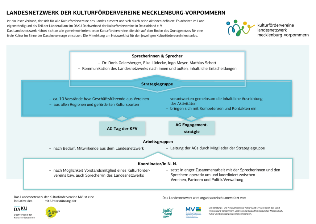 Etwa 15 Vorstände von Kulturfördervereinen aus allen Regionen und geförderten Kultursparten bringen sich in der Strategiegruppe mit ihren Kompetenzen und Kontakten ein, verantworten gemeinsam die inhaltliche Ausrichtung der Aktivitäten. Die Strategiegruppe des Landesnetzwerks hat sich 2022 aus vier regionalen Vernetzungstreffen in den Regionen um Rostock, Greifswald, Neubrandenburg und Schwerin entwickelt.